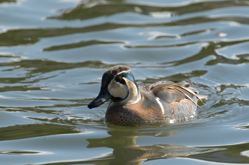 オスの巴模様の顔が特徴的なカモ類です。冬鳥として本州以南に渡来しますが、主に日本海側に多く、 では飛来が尐ないです。コガモの群れに混在した形で見る機会が多く湖沼池など主に淡水域に生息しま す。日中は休憩し、夕方に水田や河川などへ飛び、イネ科も植物などを食べます。 涸沼では、冬季に尐数が飛来し、他のカモの群れの中に混じっていることが多いです。茨城県レッドリ ストで絶滅危惧Ⅱ類です。